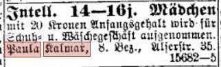 Paula Kalmar – Alserstr. 35, Wien VIII. Intelligentes Mädchen, 14–16 Jahre, gesucht für Schuh- und Bekleidungsgeschäft. Anfangsgehalt 20 Kronen.