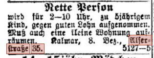 Gesucht wird eine Person für 2,00-10,00 für ein 5-jähriges Kind. Gute Bezahlung. Muss auch eine kleine Wohnung reinigen. (Erste konkrete Erwähnung eines Kindes in diesen Zeitungsanzeigen.)
