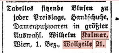 Wilhelm Kalmar in der Wollzeile 21. Ihre Geschäftsadresse im ersten Bezirk Wiens.