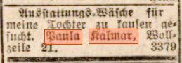 In der folgenden Zeitungsanzeige wird kein Name genannt. Eine Modistin, Paulas Beruf, steht für Arbeiten im Haus und außerhalb zur Verfügung. Und Wilhelm Kalmar, Schneider, ist in den Wiener Adressbüchern von 1908 und 1909 unter der Adresse Pelikangasse 4 aufgeführt.
