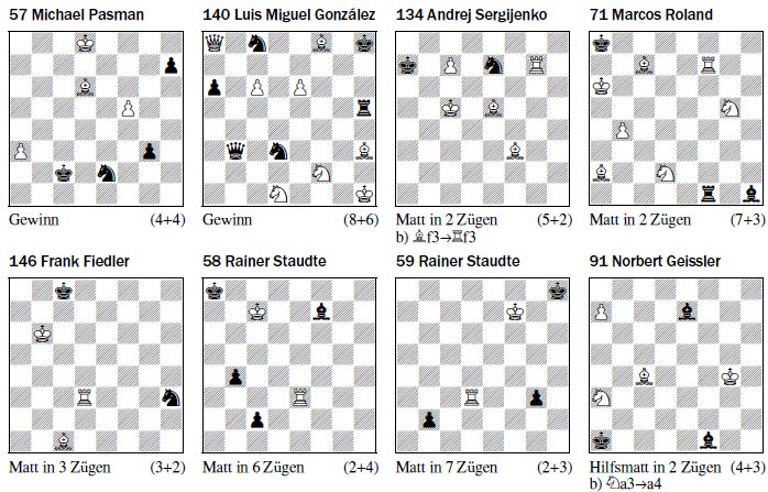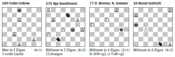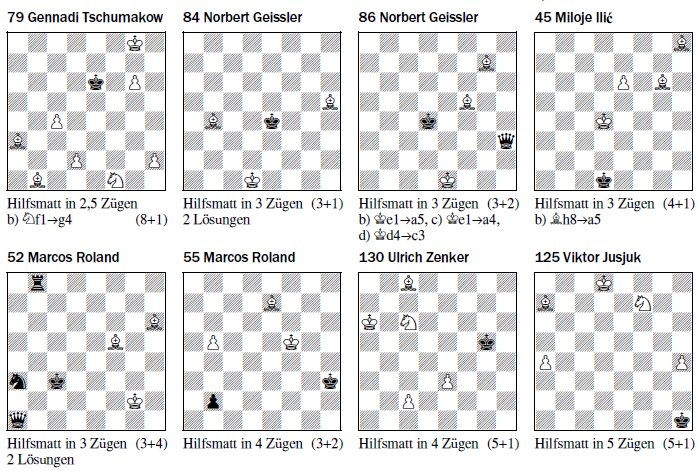 Die lobenden Erwähnungen und die Urdrucke werden in dieser Reihenfolge vorgestellt: Studien, direkte Matts, Hilfsmatts. Die Anordnung erfolgt nach der erforderlichen Zügezahl.