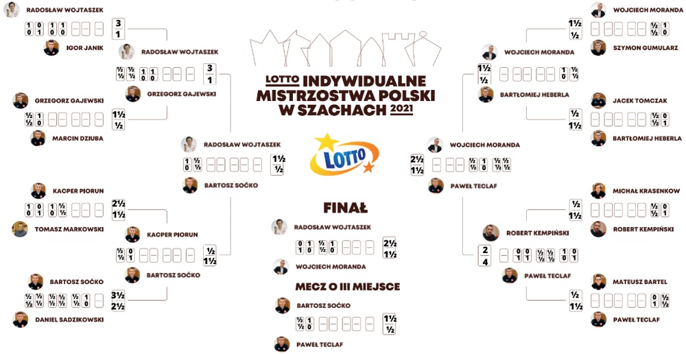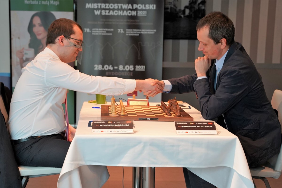 08.05.2021 – In der Stadt Bydgoszcz sind am Freitag die diesjährigen polnischen Einzelmeisterschaften zu Ende gegangen. An der Meisterschaft der Männer waren ursprünglich insgesamt 16 Spieler beteiligt, aber deren Kreis wurde von Runde zu Runde halbiert, weil das Turnier im K.-o.-Modus gespielt wurde. Im Finale saßen sich schließlich Radoslaw Wojtaszek und Wojciech Moranda gegenüber: Nachdem die beiden von den Spielern verlangten "langen" Partien zunächst ein 1:1 erbracht hatten, gewann Wojtaszek den Rapid-Tiebreak und holte sich damit den Titel. Bei den Frauen haben zehn Spielerinnen ein Rundenturnier ausgetragen, das Klaudia Kulon mit 6,0/9 gewonnen hat. | Fotos: Weronika Poczwardowska
