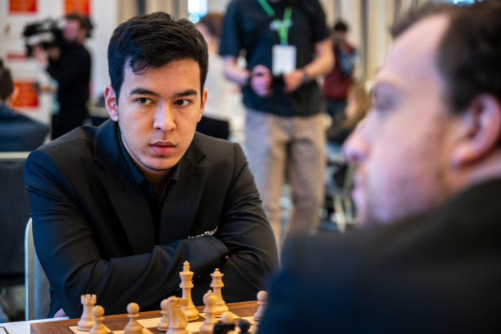 Nodirbek Abdusattorov und Hans Niemann teilten sich die Punkte in der Partie, die mit einem Najdorf-Sizilianer begann und in einem symmetrischen Endspiel mit ungleichfarbigen Läufern und je einen Turm endete.