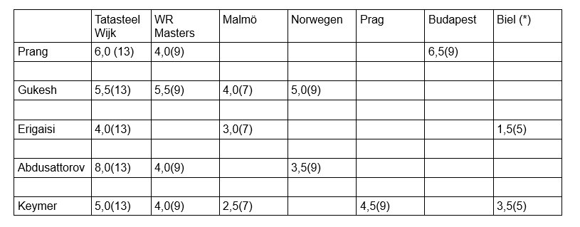 * Zum Zeitpunkt des Erstellens dieser Tabelle lief das Turnier in Biel noch