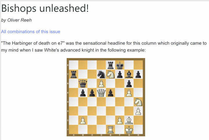 Dann verfolge ich natürlich gerne die Rubrik "Tune your tactics", die meiner Meinung nach zielgerichteter ist als die üblichen Taktiktrainer, die auf Engines basieren, die einen Unterschied in den Bewertungen einer Stellung finden und die Stellung präsentieren. Hier haben wir Oliver Reeh, der verschiedene Themen aus einer guten Auswahl von Partien vorstellt.