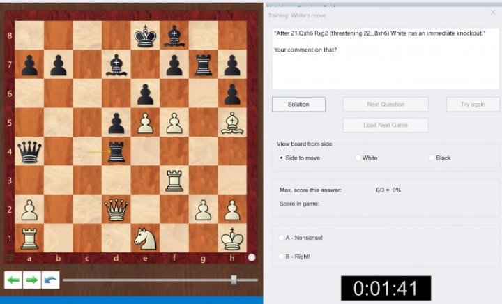 ... was sehr hilfreich ist. Es ist, als würde man in die Gedankenwelt eines Spitzenschachspielers eintauchen. Ja, die einzelnen Züge laden dazu ein, den nächsten Zug zu erraten, und dieses Hin- und Herraten mit dem richtigen Feedback von Ris hilft einem Amateur oder Vereinsspieler, den Unterschied im Denken, Bewerten und Berechnen von Varianten im Vergleich zu einem Profi zu verstehen.