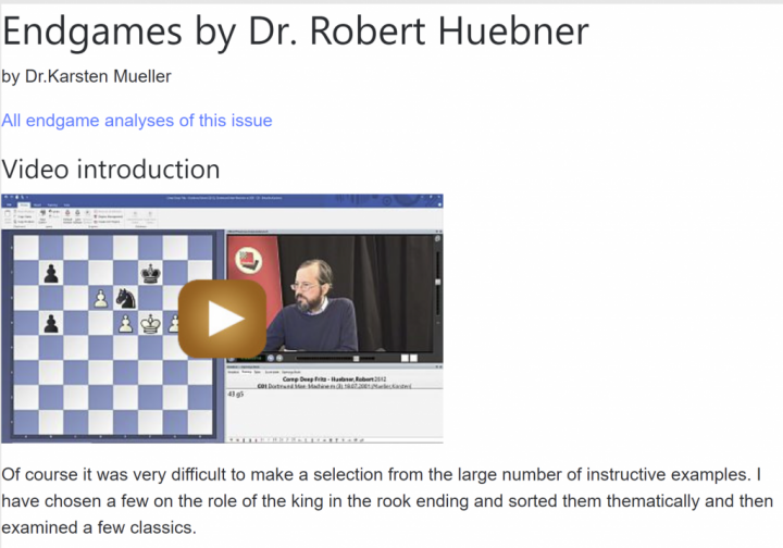 "Special" zu Robert Hübner mit Partieanalysen und Videos zu Strategie und Endspiel. Firouzja, Oparin, Predke, Sevian, Vitiugov u.a. kommentieren ihre Partien vom Grand Swiss 2021. Eröffnungsvideos von Kasimdzhanov, Ragger und Marin. 11 Eröffnungsartikel