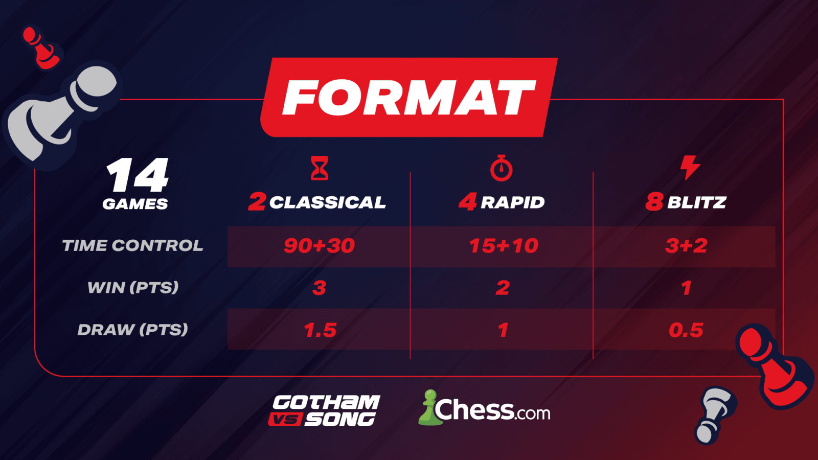 Insgesamt stehen 14 Partien auf dem Programm, aufgeteilt in drei klar unterscheidbare Abschnitte: Zwei klassische Begegnungen (90+30), vier Rapid-Partien (15+10) und acht Blitzschach-Duelle (3+2). Und so funktioniert die Punkteverteilung: Ein Sieg in den klassischen Partien bringt 3 Punkte, ein Remis 1,5. In den Rapid-Partien gibt es 2 Punkte für einen Sieg und 1 für ein Unentschieden, im Blitz einen Punkt für den Sieg und einen halben für ein Remis.