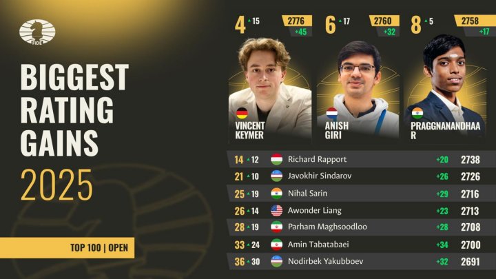 Mehrere Spieler starteten 2025 außerhalb der Top 100 der Open-Weltrangliste, schafften es aber durch starke Ergebnisse in diese Elitegruppe. Absolut betrachtet sind ihre Ratingzuwächse noch beeindruckender. Der „Basiseffekt“ muss dabei aber berücksichtigt werden: Je niedriger das Ausgangsrating eines Spielers ist, desto leichter lassen sich große Punktezuwächse erzielen.