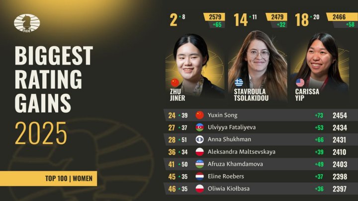 Xeniya Balabayeva schaffte den Sprung unter die Top 100 nach einer starken Leistung bei den Grenke Open (+39) und legte dann mit herausragenden Leistungen bei der Asian Women's Championship (+41) und den Oskemen Open Masters (+39) nach, wodurch sie mit einem außergewöhnlichen Zuwachs von 121 Ratingpunkten auf Platz 70 kletterte.