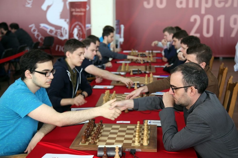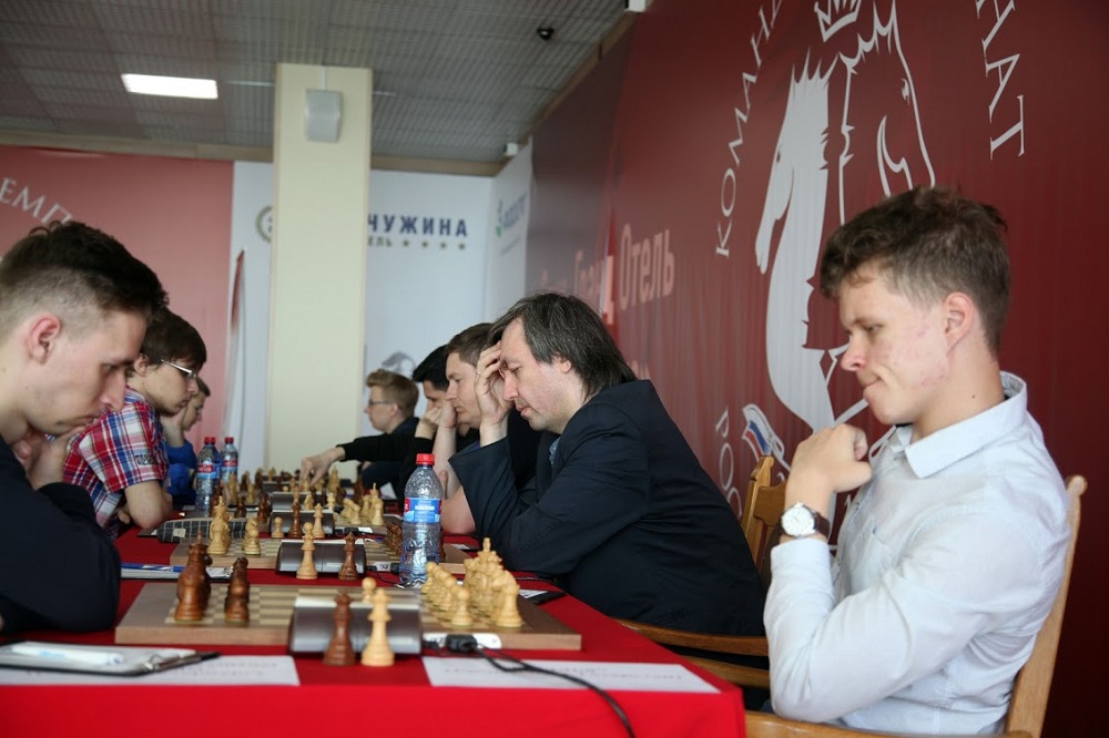 In Runde 9 spielte "Bronzener Reiter" (rechts: Leinier Dominguez) gegen "Molodezhka" mit David Paravyan und Andrey Esipenko an den Spitzenbrettern.