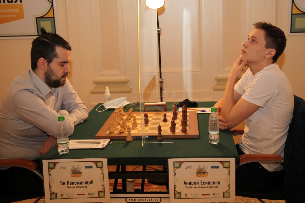 Ian Nepomniachtchi und Sergey Karjakin lagen in diesem Turnier nach Punkten öfters gleichauf, so auch vor der heutigen Vorschlussrunde. Nach seiner gestrigen Niederlage gegen Daniil Dubov zeigte sich Nepomniachtchi heute gut erholt, spielte gegen Andrey Esipenko mit einem Figurenopfer auf Sieg und hatte dann das Glück, dass sein junger Gegner sich mit einer Mehrfigur nicht mit einem Remis zufrieden geben wollte. Das wäre aber wohl nötig gewesen.