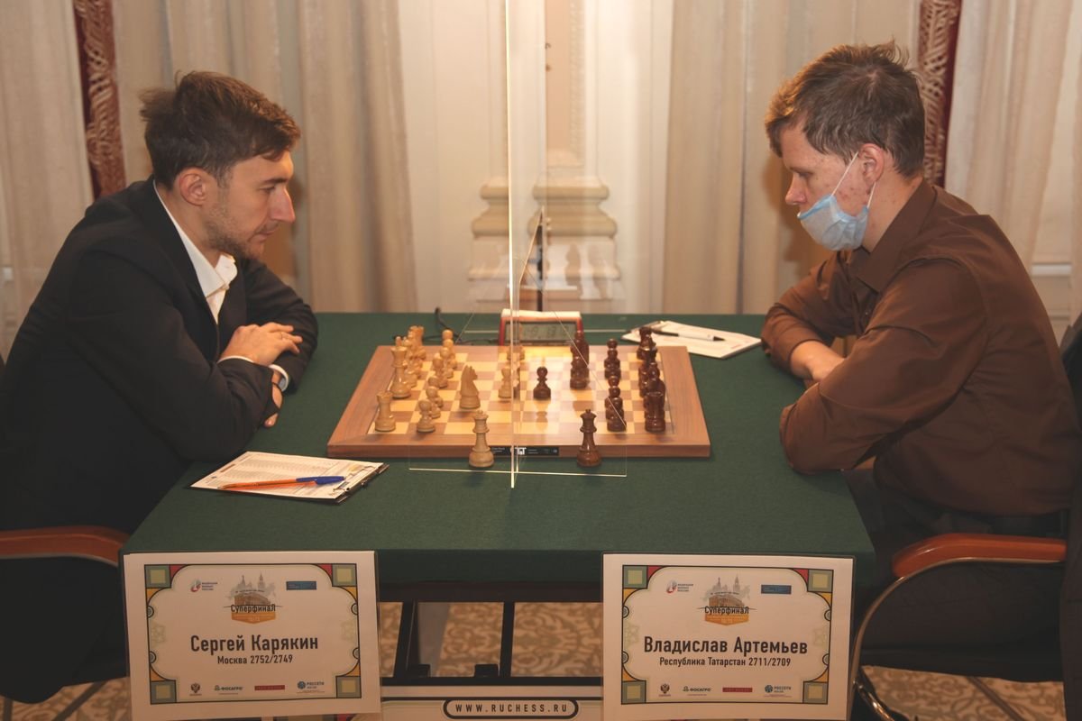 Am Nebentisch setzte sich Sergey Karjakin, ebenfalls mit Weiß, gegen Vladislav Artemiev durch.