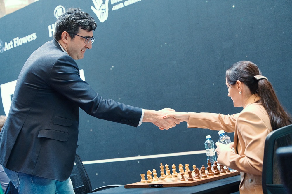 Für die Russen gibt es in Kasachstan - wie nicht anders zu erwarten - überhaupt keine Probleme: Vladimir Kramnik begrüßt Kateryna Lagno