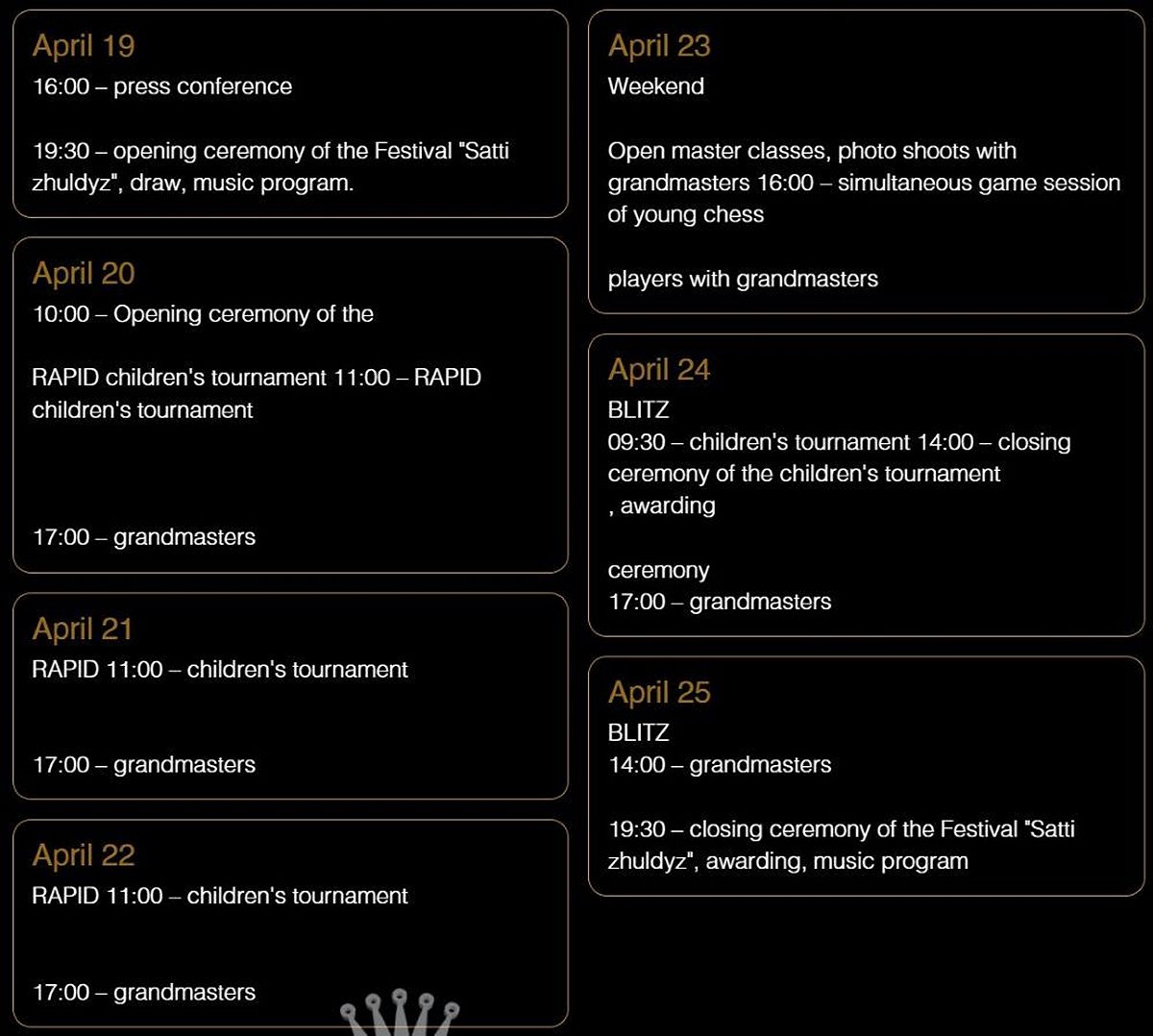 Im Rahmen der Schachweltmeisterschaft wird in Astana das Satty Zhuldyz Schachfestival 2023 ausgetragen.