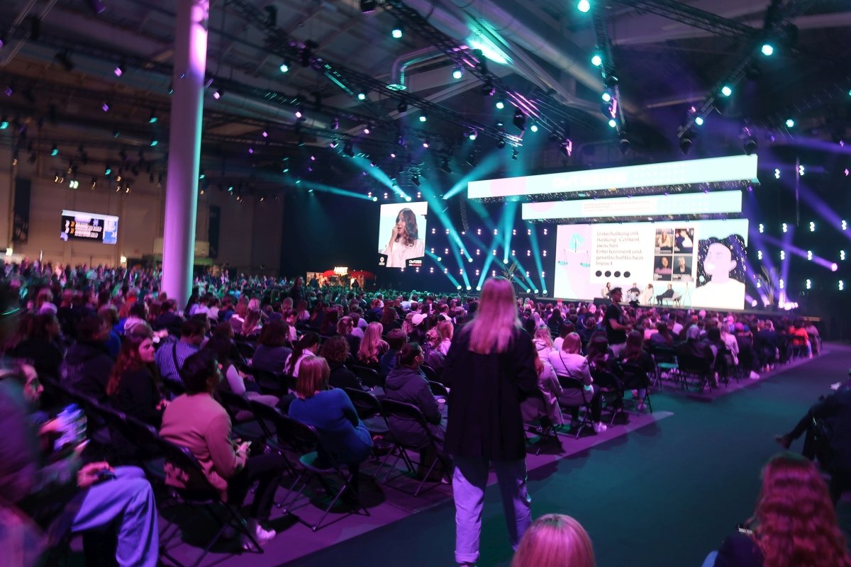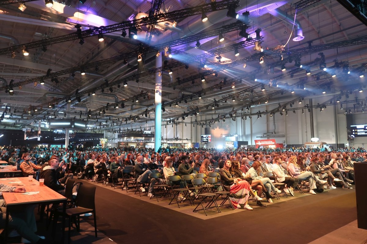 Vor den vier Bühnen in den verschiedenen Hallen versammelt sich auf den vielen davor bereit gestellten Stühlen und Tischen das interessierte Publikum und schaut sich die thematischen Präsentationen und Erläuterungen der Speaker an.