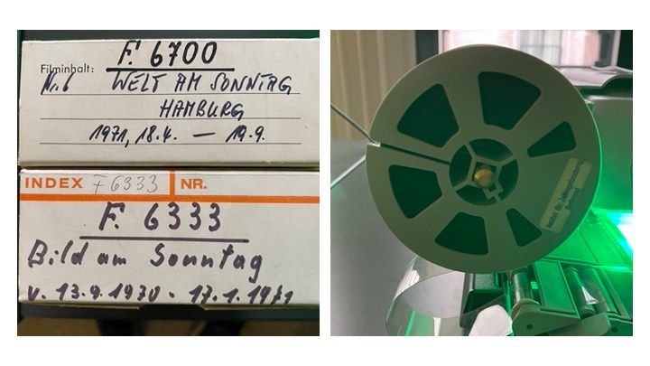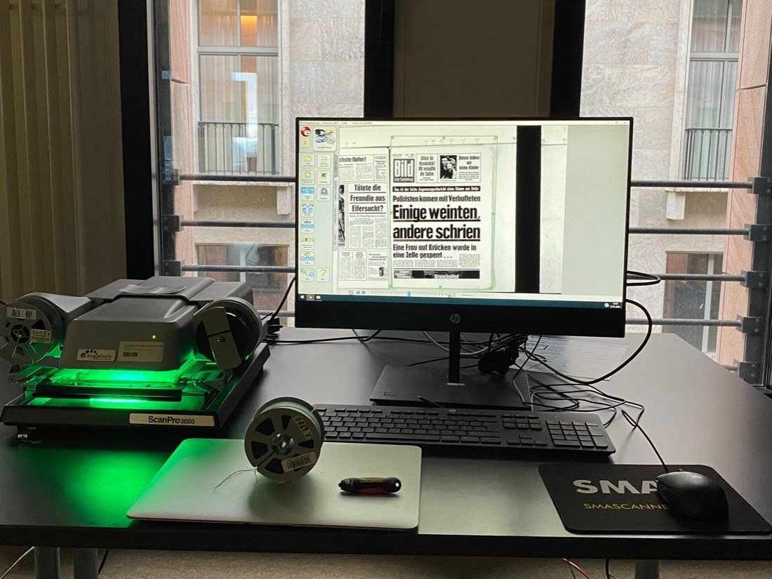 Meine vorbestellten Zeitungen lagen für mich schon im Mikrofilmformat bereit. Das Einfädeln der Filme in den Scanner ist für einen Grobmotoriker eine Herausforderung, die ich aber schließendlich erfolgreich meisterte.