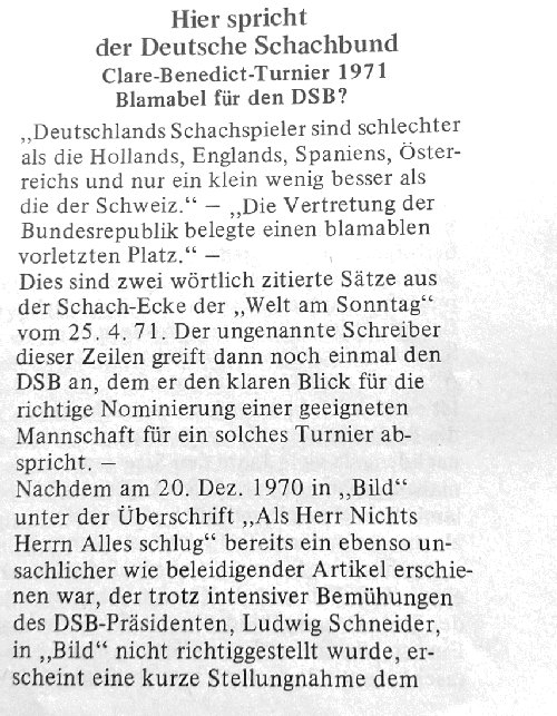 Früher war natürlich alles besser. Aber die Tatsache, dass früher das Abschneiden der deutschen Nationalmannschaft sogar den Springerzeitungen eine Meldung wert war, hat mich dann doch überrascht. Beim Blättern in einer alten Deutschen Schachzeitung von 1971 bin auf folgenden Artikel gestoßen [Reiber1971]::