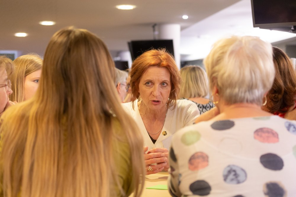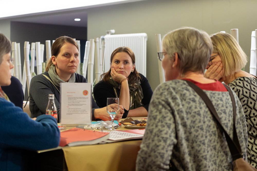 Die Leiterin des Grundschulreferats Nikola Schroth diskutiert mit Lehrerinnen, wie leistungsschwache und lernschwache Kindern auf den Schachunterricht reagieren