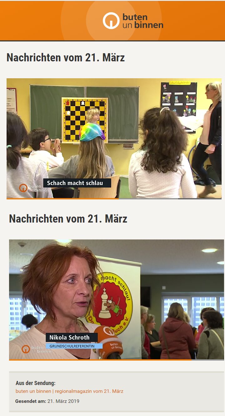 Das wäre ganz im Sinne der Bremer Schulsenatorin Dr. Claudia Bogedan: „Unser Ziel ist es, das Projekt auf noch mehr Schulen zu übertragen.“ Und es gab gestern auch einen kleine Filmpremiere: das Schach-Projekt wird in 4 min vorgestellt, ab jetzt öffentlich auf www.schachmachtschlau.de