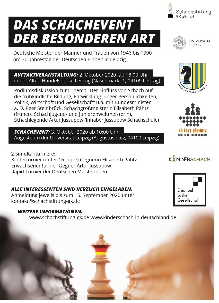 15.07.2020 – Zum 30. Jahrestag der Deutschen Einheit organisieren Gerhard Köhler und die Schachstiftung GK in Leipzig ein Schachevent mit den Deutschen Meistern und Meisterinnen aus den Jahren 1946 bis 1990. Im Rahmen des Treffens gibt es eine Podiumsdiskussion und Simultanvorstellungen. Alle Schachfreunde sind herzlich eingeladen.