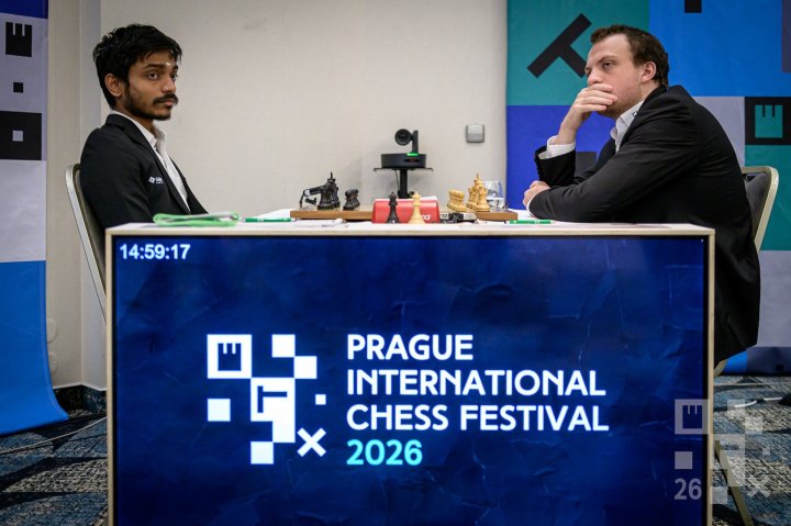 27.02.2026 – Runde 1 des Masters in Prag brachte vier Siege und ein Remis, in Runde 2 ging es mit drei Remis und zwei Siegen gemächlicher zu. Aber die Gewinnpartien waren interessant. David Anton stand nach der Eröffnung schlecht gegen Jorden Van Foreest, gewann dann aber unerwartet schnell in nur 27 Zügen. Und Hans Niemann übersah gegen Aravindh Chithambaram in Gewinnstellung und Zeitnot eine versteckte taktische Möglichkeit und verlor. | Bild: Aravindh Chithambaram und Hans Niemann | Fotos: Petr Vrabec, Schachfestival Prag