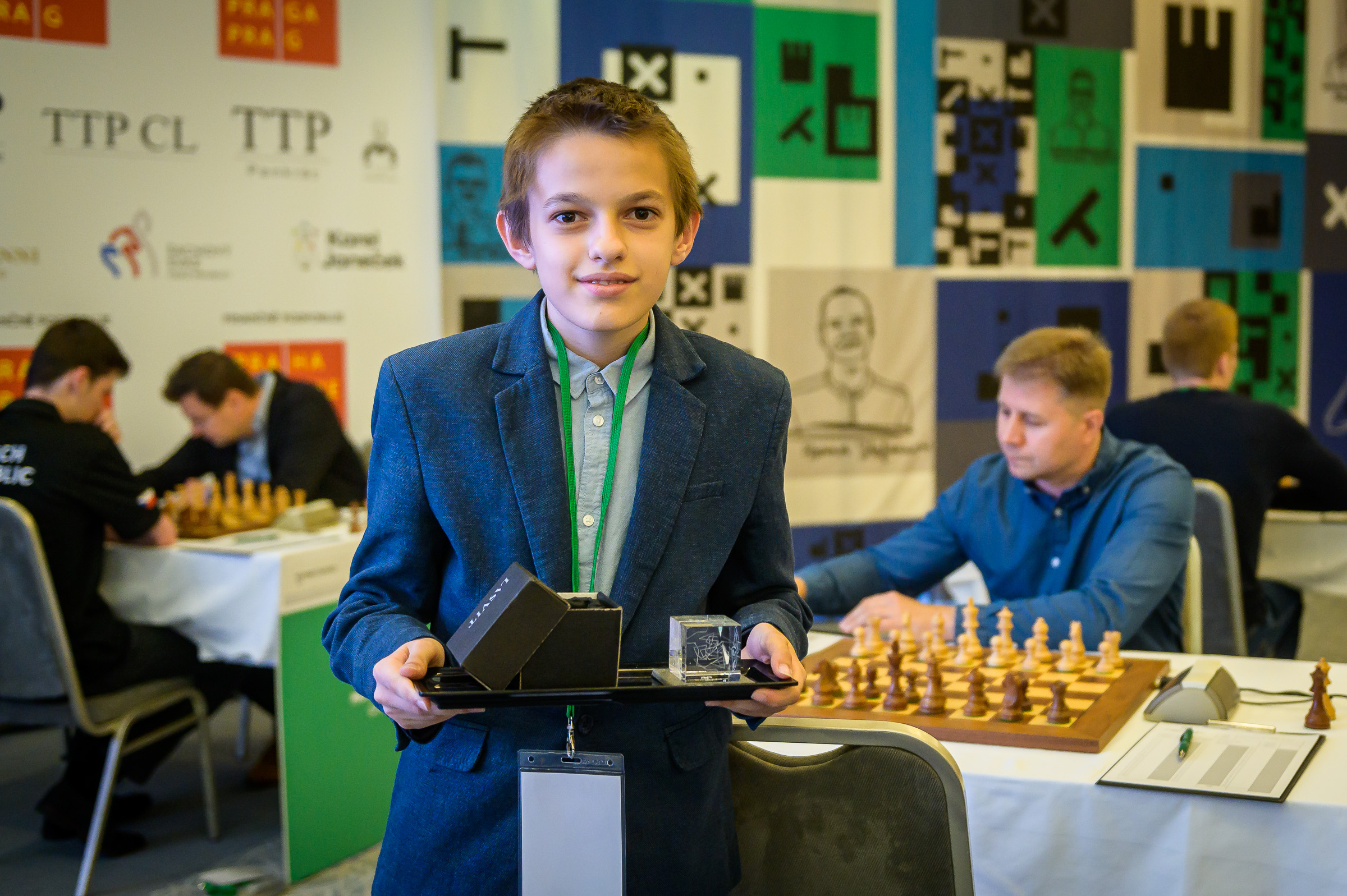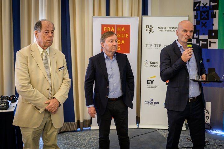 Hauptschiedsrichter Pavel Votruba und Dirk Jan ten Geuzendam schauen zu, wie Turnierdirektor Petr Boleslav (rechts) vor Beginn der siebten Runde den Preis für die beste Partie der 6. Runde verleiht. Der Preis ging an Vaclac Finek. | Foto: Petr Vrabec