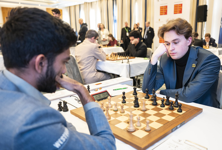 Was für eine Spannung, was für eine Überraschung: Lange Zeit sah alles nach einer unveränderten Situation an der Spitze der Tabelle aus. Mit ausgeglichenen Stellungen gingen die drei vorne liegenden Spieler in ihre Endspiele. Jorden van Foreest stand ausgeglichen gegen Aravindh Chithambaram. Doch nach einem unvorsichtigen Springerzug gefolgt von einem fehlerhaften Königszug auf die h-Linie nutzte der Inder die Chance, den seit vielen Runden vorne liegenden Niederländer von der Pole Position zu stoßen:
