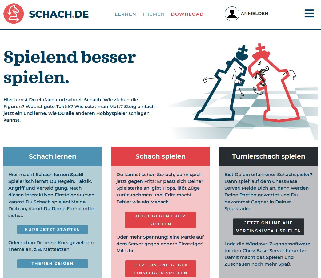 Noch einen kleinen Schritt weiter geht das gemeinsame Schachportal von ChessBase und dem Spiegel. Hier wird ein vollständiger Schachkurs präsentiert. Wer den interaktiven Schachkurs durchgearbeitet hat, kann sich getrost im Schachklub anmelden.