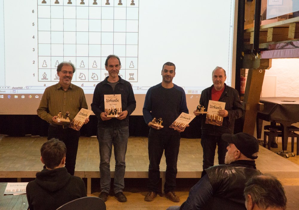 Die Sieger des Jubiläumsturniers des Vogtländischen Schach-Clubs Plauen 1952 e.V. am 05.11.2022 sind stolz auf die extra angefertigten Schachpokale „Vater & Sohn“ nach Motiven des Bildes „Schach dem Vater“ von Erich Ohser. Kay Kempe von Aufbau Chemnitz gewann überlegen mit 10,5 aus 11 Punkten.