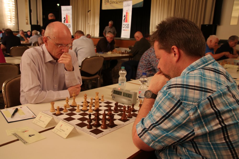 Auch bei den Ü65ern hat keiner mehr die Idealpunktzahl. Fünf FM weisen 3,5 Zähler auf, bevor Brüggemann (3) kommt. Dem IM trotzte der neben Willy Rosen älteste Teilnehmer: Erich Krüger. Der 91-Jährige ließ gegen den 20 Jahre jüngeren "Jungspund" aus Erfurt nichts anbrennen und remisierte! In Front liegen Schulz, Namyslo, Bodo Schmidt (Siegburg), Wolfgang Schmidt (Stuttgart) und der Zehlendorfer Wolfram Heinig.