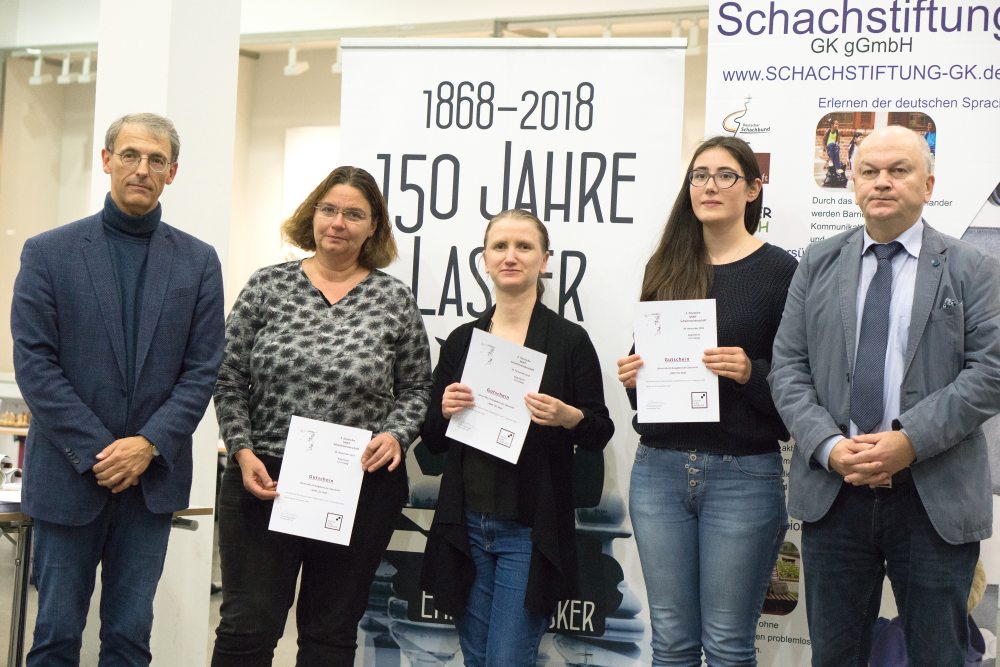 Thomas Weischede und Dr. Gerhard Köhler mit den drei besten Frauen: Anet Gempe (3. Platz), Katja Hartung (2. Platz), Elina Otikova (1. Platz)