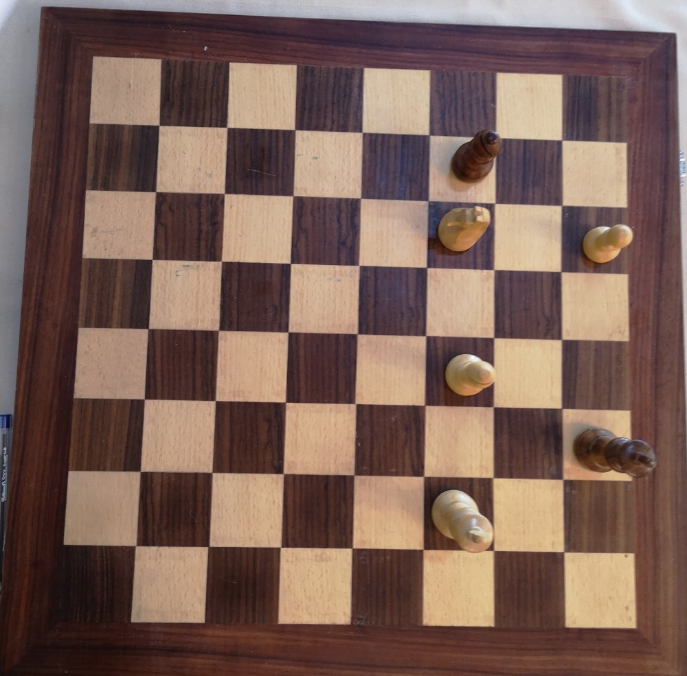 Wer kann von sich aus Erfahrung sagen, dass er mit Springer und Läufer in der sechsten oder siebten Stunde einer Turnierpartie unter 50 Zügen mattsetzen kann? Beim Weg zum Abendessen sah ich eine Partie zweier Spieler in der Kategorie U2000 bei der es gleich zur Technikübung kommen würde, dachte ich. Ich entschied mich nach dem Essen noch einmal im Turniersaal vorbeizuschauen. Weiß drohte a6-a7 und daher würde Schwarz den Läufer geben müssen, so meine Überlegungen zu dem Endspiel. Würde es der Weißspieler aus Österreich schaffen, seinen Gegner aus Polen mattzusetzen? Bei der deutschen Seniorenmeisterschaft in Hamburg 2018 hatte ein Spieler mit dem ehrlichen Bekenntnis “Das kriege ich nicht hin“ sofort Remis gegeben. Die Auflösung, wie es diesmal ausging, folgt am Ende.