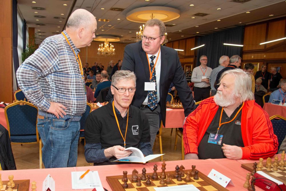Schiedsrichter und DSB-Bundesrechtsberater Thomas Strobl (stehend, Mitte) informiert das Team der Lasker-Schachgesellschaft (v.l.n.r. Dr. Gerhard Köhler, Felix Levin und GM Artur Jussupow) über das vorzeitige Turnierende
