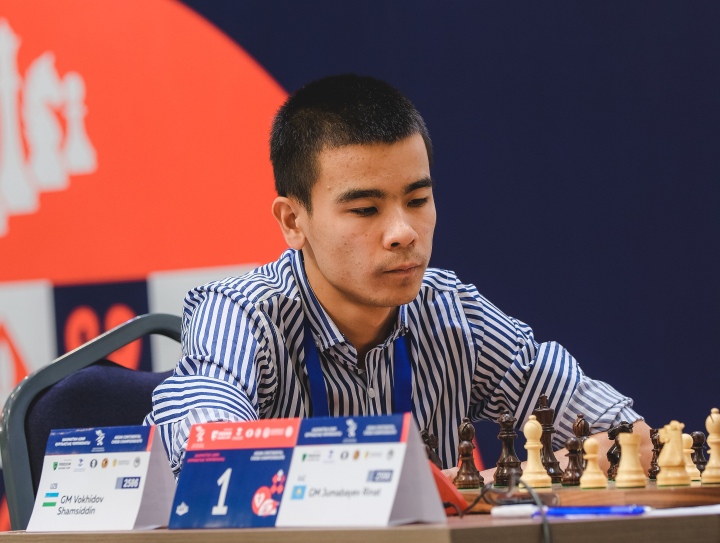 Shamsiddin Vokhidov (Foto unten) übernahm nach seinem Sieg gegen Rinat Jumabayev im Duell der Spitzenreiter in Runde 6 die Führung im offenen Turnier und gab sie bis zum Ende nicht mehr ab. Mit 7/9 Punkten beendete der 21-jährige Usbeke das Turnier als alleiniger Erster, einen halben Punkt vor einer großen Gruppe von Spielern mit 6½/9 Punkten, darunter der Topgesetzte Arjun Erigaisi aus Indien.
