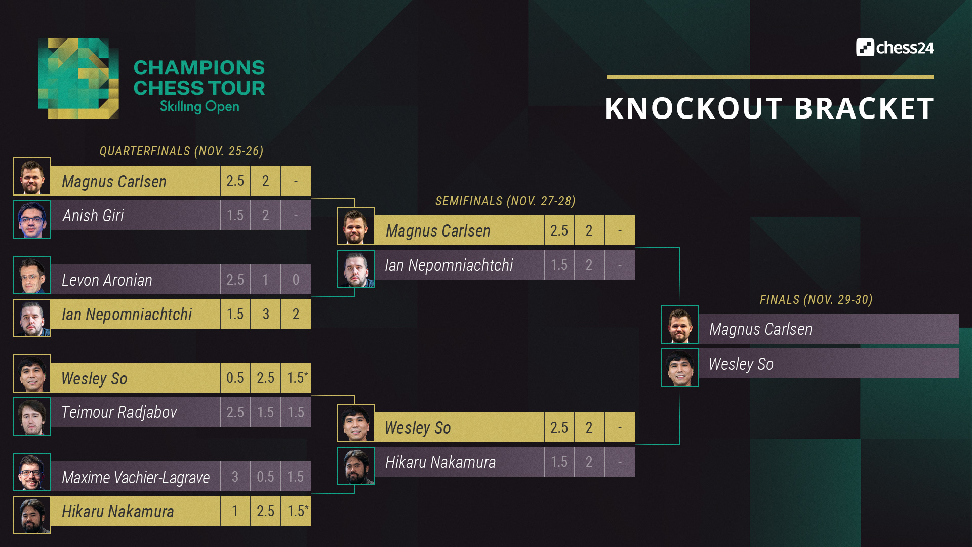 Zwischen Wesley So und Hikaru Nakamura gab es am zweiten Halbfinaltag ausschließlich Remisen, so dass der einzige Sieg von So am Tag zuvor dieses Duell bereits entschieden hatte.