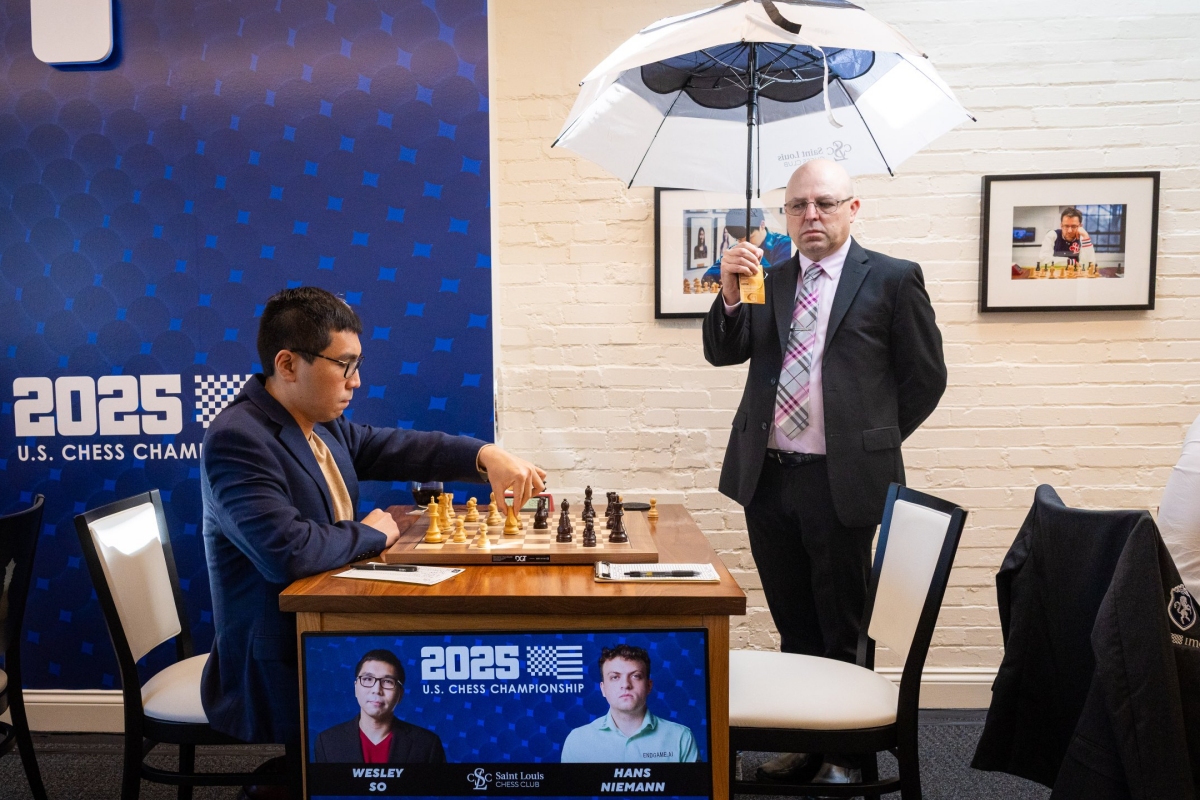 Am Sonntag wurde in Saint Louis die erste Runde der US-Meisterschaft gespielt und es stellte sich heraus, dass die Mittagssonne so intensiv in eines der Fenster hineinschien, dass Spieler geblendet wurden. Das helle Sonnenlicht war am Tisch von Wesley So und Hans Niemann besonders grell und schien Wesley So so stark ins Gesicht, dass der US-Großmeister sich in seiner Konzentration beeinträchtigt sah.