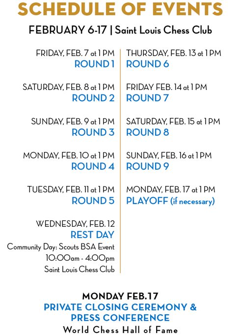 Die erste Runde wird am Freitag, 7. Februar gespielt. Rundenbeginn ist täglich 13:00 Uhr Ortszeit (= 20:00 Uhr MEZ).