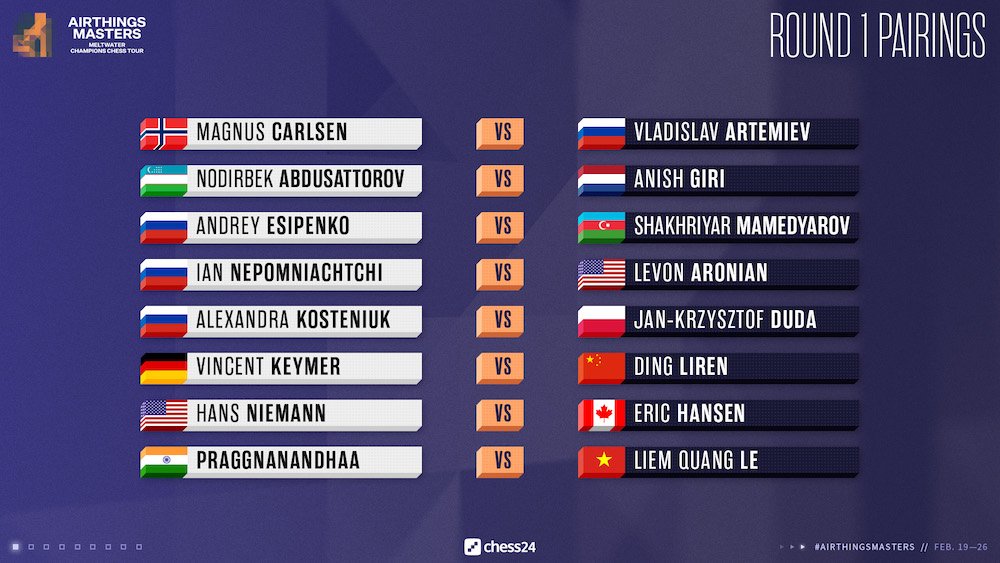 Die neue Meltwater Champions Chess Tour 2022 beginnt am Samstag, den 19. Februar mit dem Airthing Masters. Zu den Teilnehmern des Auftaktturniers gehört Weltmeister Magnus Carlsen und die frisch gebackenen Schnellschach-Weltmeister der Frauen und Männer. Alexandra Kosteniuk und Nodirbek Abdusattorov, die beide bei der Tour debütieren.