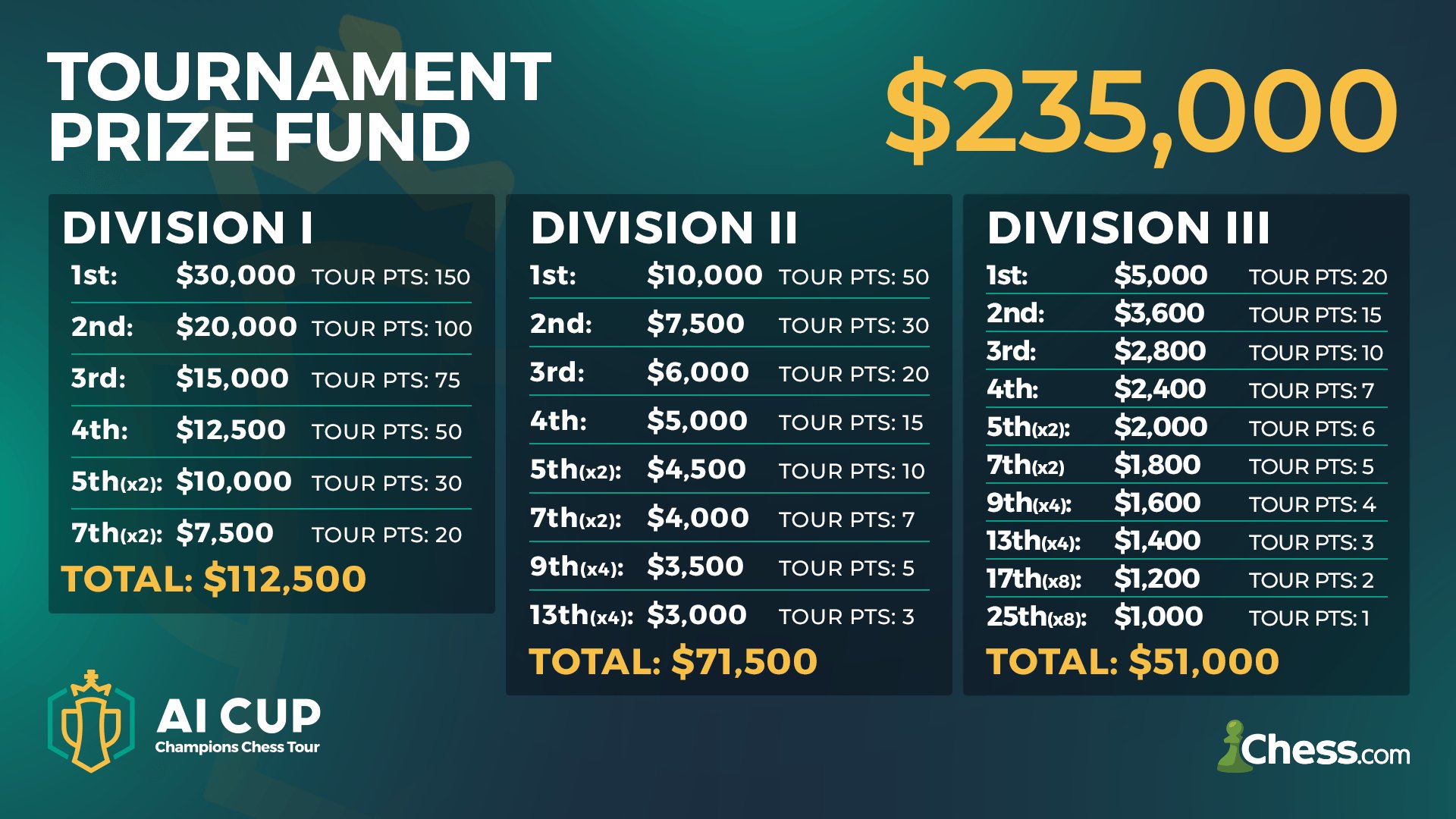 In jeder Division gibt es Preisgelder und Tour-Punkte zu gewinnen. Weitere Informationen finden Sie im Abschnitt Preise weiter unten.