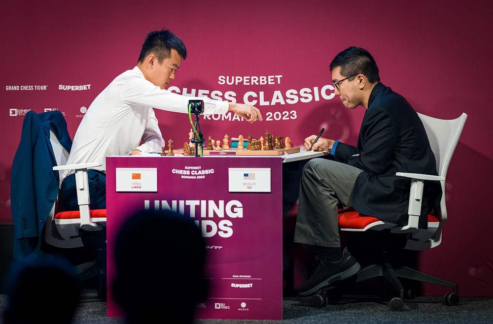 Wesley So stand, mit den schwarzen Steinen spielend, gegen Ding Liren gleich zweimal auf Gewinn. Zuerst versäumte er es, mittels eines Qualitätsopfers auf d5 das Feld f4 für seinen Springer zu sichern, und als er ein zweites Mal großen Vorteil erlangt hatte, beendete er die Partie mit einer dreimaligen Stellungswiederholung - was auch immer der Grund dafür gewesen sein mag.