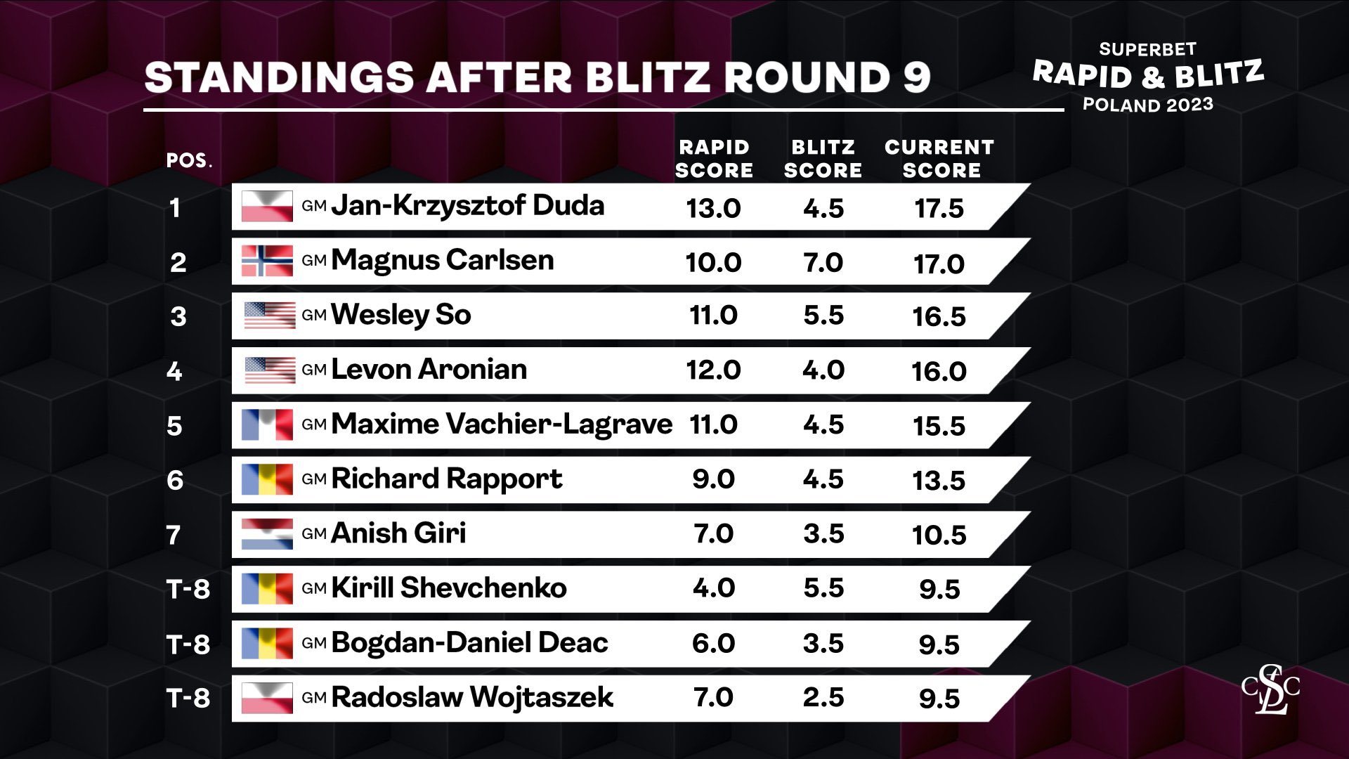 Mit seinem starken Blitzergebnis ist Magnus Carlsen (17 Punkte) nun in der Gesamtwertung bis auf einen halben Punkt an den noch führenden Jan-Krzystof Duda (17,5 Punkte) herangerückt.