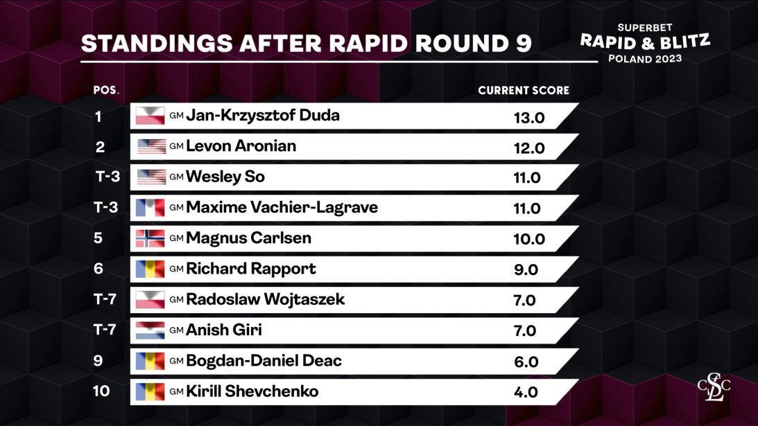 Neuer Spitzenreiter nach dem Schnellschachturnier ist indes Jan-Krzysztof Duda.