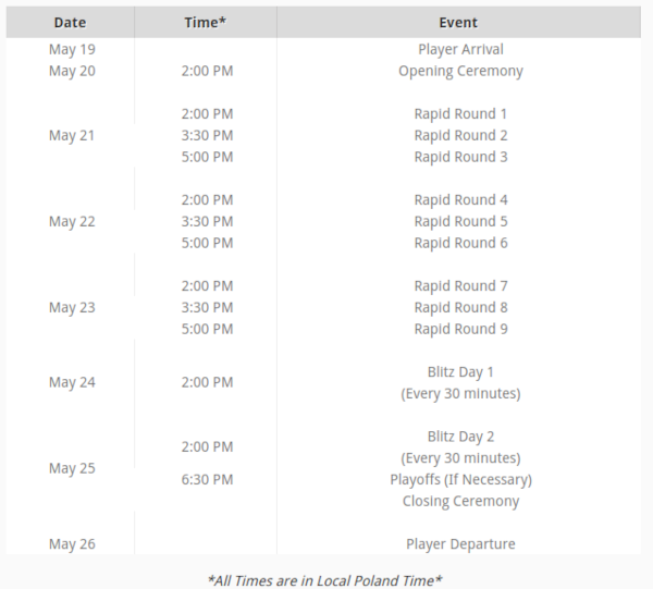 Das Rapidturnier mit 25+10-Partien wird an den ersten drei Turniertagen als Rundenturnier ausgetragen. Ein Sieg bringt zwei Punkte für die Gesamtwertung, ein Remis einen Punkt. Das Blitzturnier wird doppelrundig gespielt. Ein Sieg bringt einen Punkt, ein Remis einen halben Punkt. Angesichts von neun Runden Rapid und achtzehn Runden Blitz lassen sich also maximal 36 Punkte für die Gesamtwertung gewinnen.