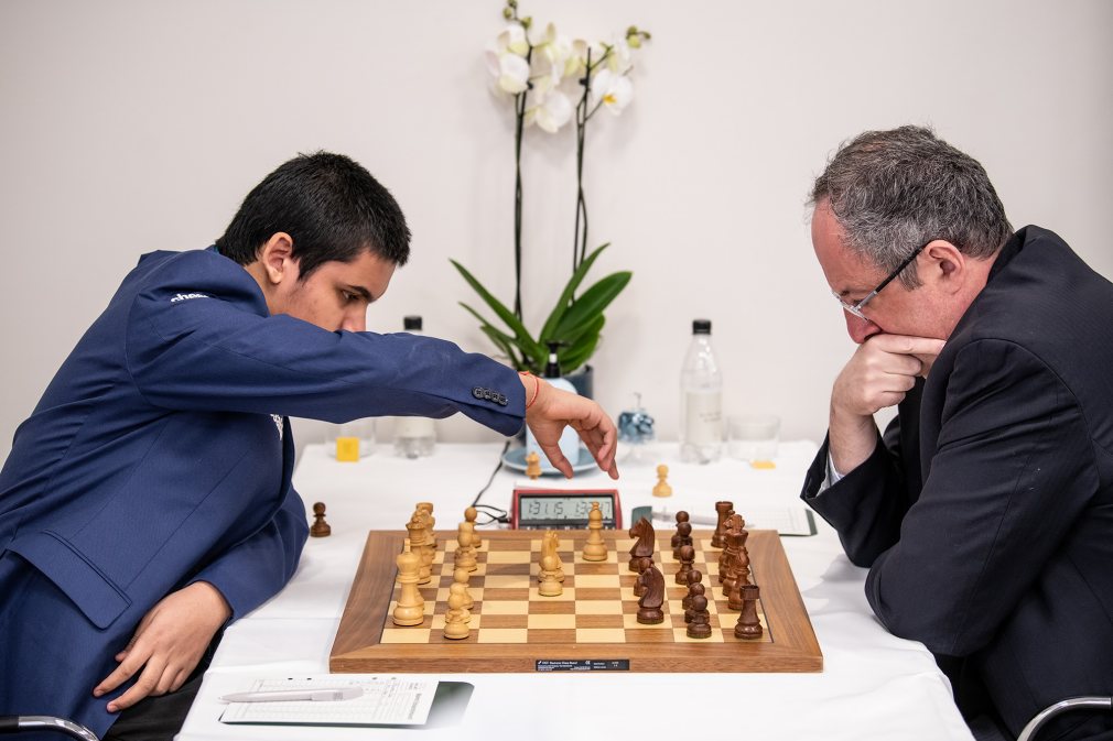 Der andere Spitzenreiter, Peter Svidler, führte in der Schlussrunde die schwarzen Steine gegen Gukesh. Svidlers Versuch, die Grünfeld-Verteidigung zu erreichen wurden vom jungen Inder mit 3.f3 gekontert. In der Folge entstand eine Königsindische Struktur mit einigen Freestyle-Elementen, aus der sich bald eine sehr lebhafte Partie entwickelte, nachdem Gukesh lang rochiert und Svidler das Zentrum mit einem zeitweiligen Figurenopfer aufgebrochen hatte. Nach munterem Verlauf mit gegenseitigen Königsangriffen endete auch diese Partie durch Dauerschach mit der Punkteteilung.
