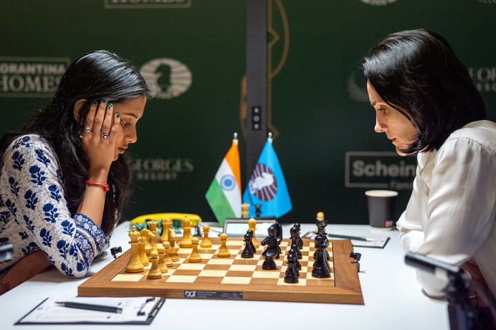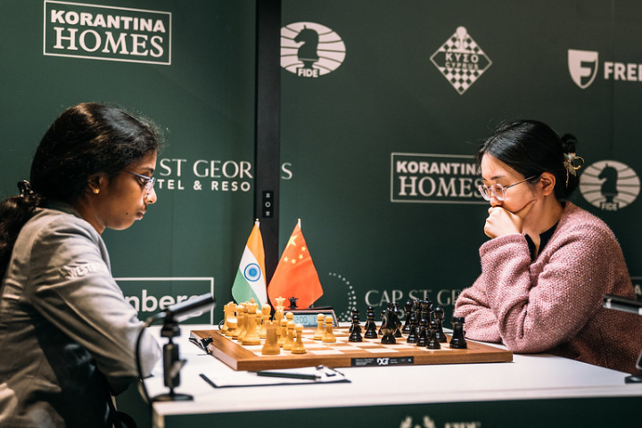 06.04.2026 – Divya Deshmukh und Kateryna Lagno machten Überstunden am Brett. Nach 135 Zügen akzeptierte Deshmukh, dass sie mit einem halben Punkt den Turniersaal verlassen würde und entließ ihre Gegnerin so in den Ruhetag. Vaishali Rameshbabu gewann gegen Tan Zhongyi, die weiteren Partien endeten in einem Remis. Vaishali springt so auf Platz 2 mit 4 Punkten, nur ein halber Punkt hinter Anna Muzychuk auf Platz 1. | Foto: FIDE / Yoav Nis