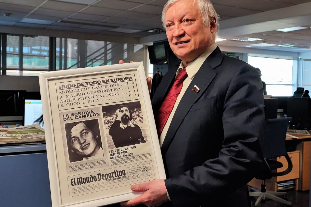 Als Gastgeschenk eine alte Ausgabe der Zeitung mit Karpov auf dem Titelblatt.