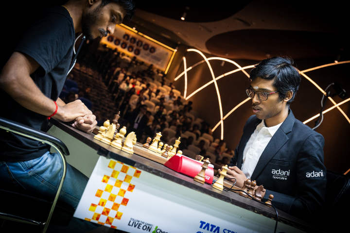 Praggnanandhaa konnte nicht direkt um die Tabellenspitze mitspielen, konnte mit seinem Sieg gegen Arjun Erigaisi trotzdem auf die Verteilung der Podestplätze einwirken. In Runde 11 gewann er gegen Aravindh mit Schwarz. | Foto: Lennart Ootes