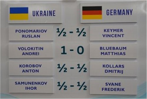 Nach der Auftaktniederlage gegen Dänemark und Siegen gegen die Schweiz und Georgien in den Runden zwei und drei kam in Runde vier gegen die Ukraine wieder Sand ins Getriebe der deutschen Mannschaft. Matthias Blübaum, der an Brett 2 spielte, erwischte einen rabenschwarzen Tag - um die Gewinnchancen zu erhöhen, spielte er eine scharfe Variante, aber erlitt gegen Andrei Volokitin bereits in der Eröffnung Schiffbruch und stand nach nur einer Ungenauigkeit bereits auf Verlust.