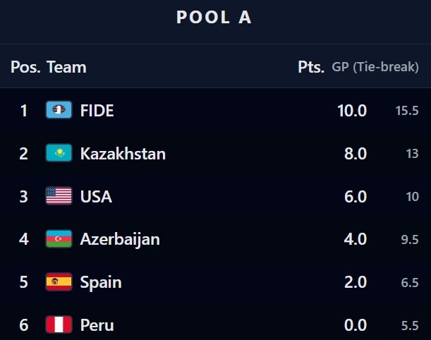 Parallel dazu blieb Team FIDE ungeschlagen und beendete die Gruppenphase mit einer makellosen 100-Prozent-Bilanz. Die USA dagegen erlebten eine bittere Überraschung: Eine klarer 0,5:3,5-Niederlage gegen Kasachstan warf sie hinter die Kasachinnen zurück, die sich damit den zweiten Platz sicherten.
